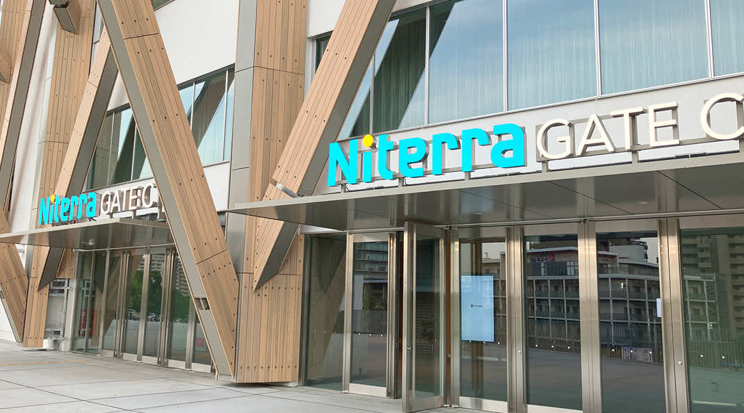 Niterra GATE|2階Niterraロゴを冠したゲートにてIGアリーナへお越しの皆さまをお迎えします。大津通り沿いからも見えるゲートがNiterra GATEとなります。お近くをお通りの際はぜひご覧ください。